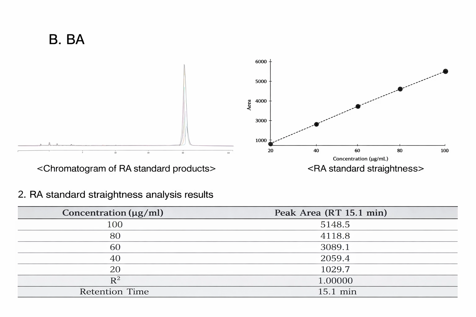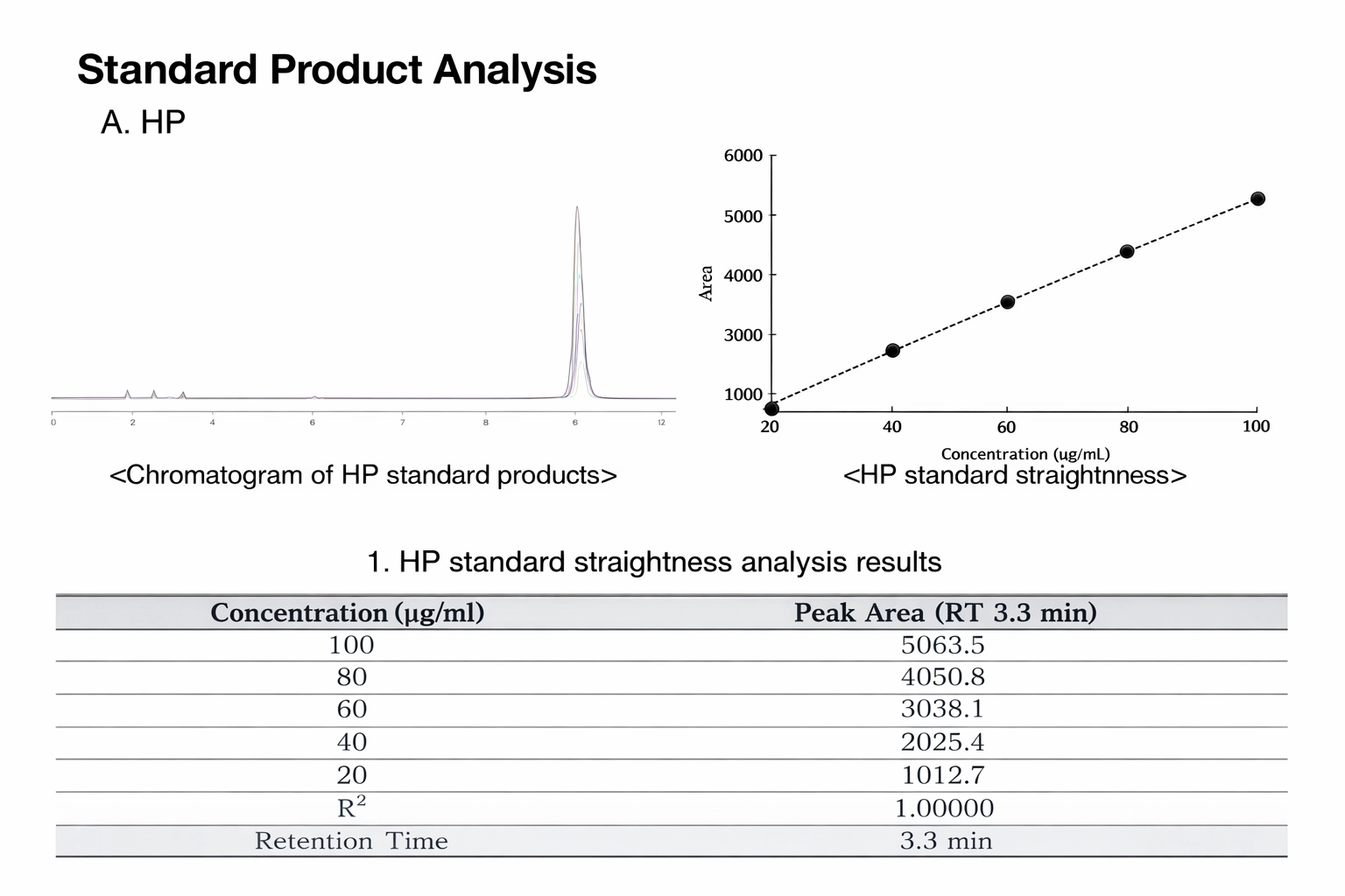 Chromatogram + linearity (standard straightness).